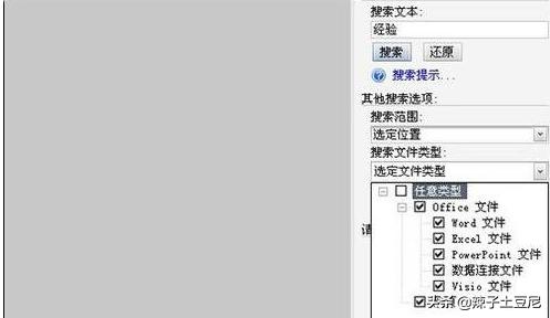 步骤三:在“搜索文本”中输入文档的关键字词,前提是这些关键字词出现在要搜索的文档或属性中。例如我输入经验。